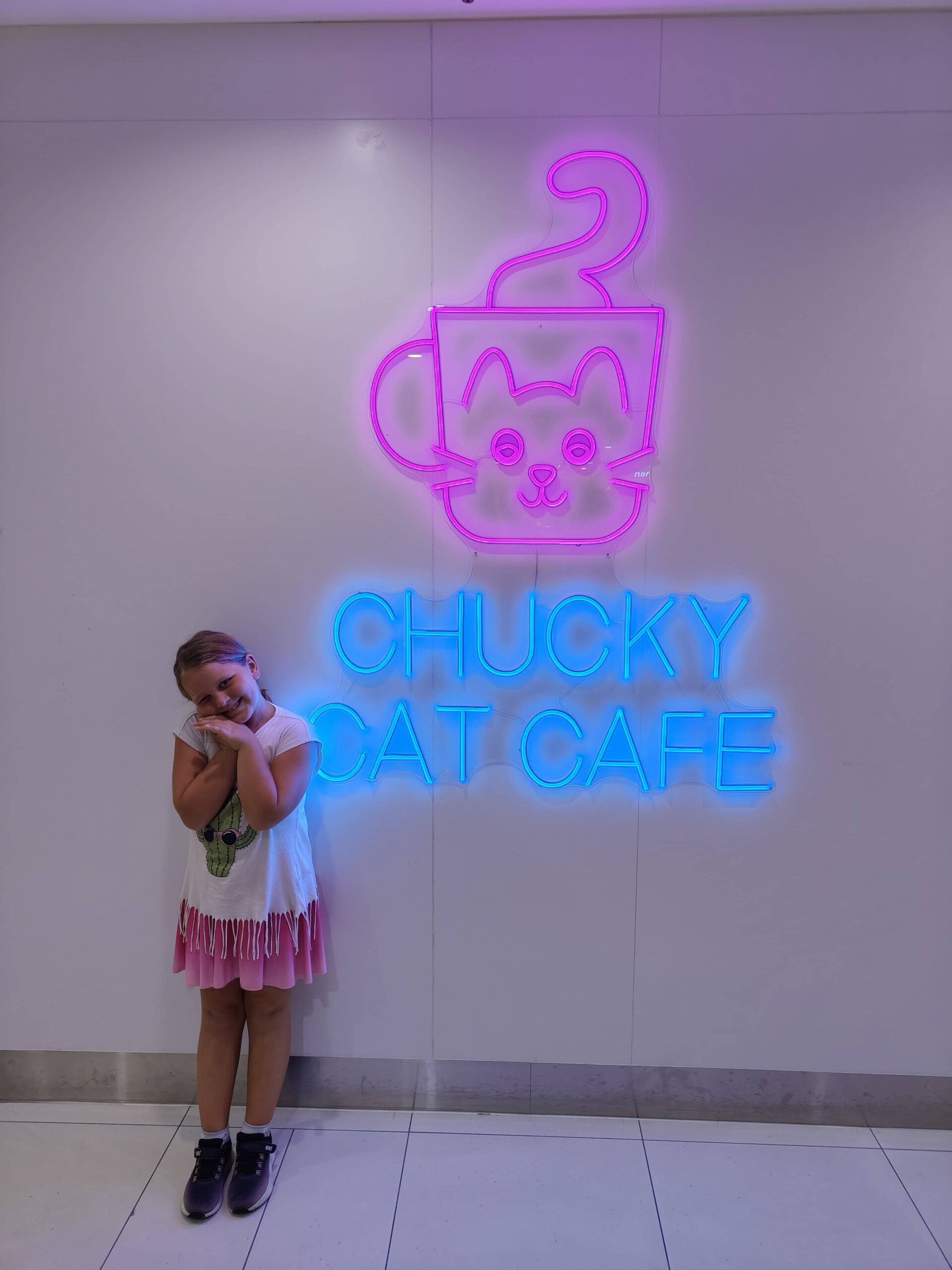 V istem nakupovalnem središču smo našli presenečenje za našo najmlajšo – Cat Caffe. Čeprav sem bila najprej skeptična, nismo mogli mimo. Tamala res obožuje mačke in tukaj je za njih lepo preskrbljeno. Izgledajo sicer zdolgočasene in naveličane ampak ne manjka jim pa hrane in ljubezni. Pred vstopom so nas razkužili in preobuli ter tako poskrbeli, da mucki ostanejo zdravi.